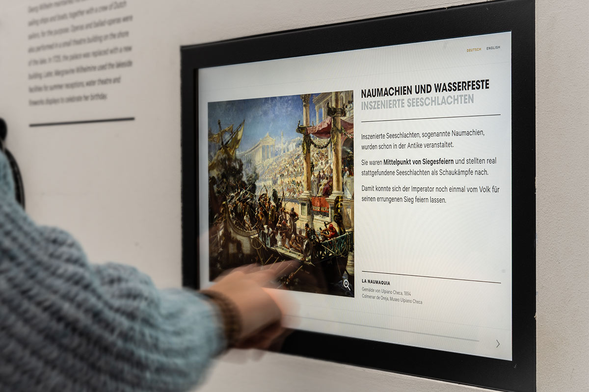 Intuitive Touch-Medienstationen, die mit einem perfekt zur Szenographie abgestimmten UX-Design dazu einladen, erforscht zu werden.